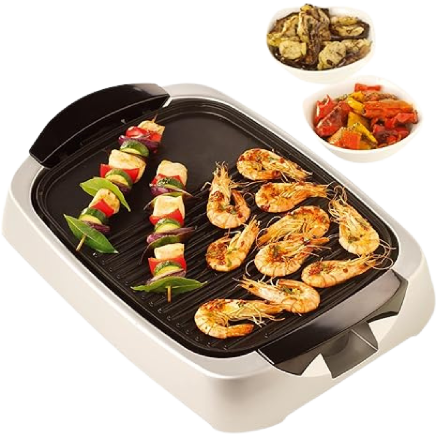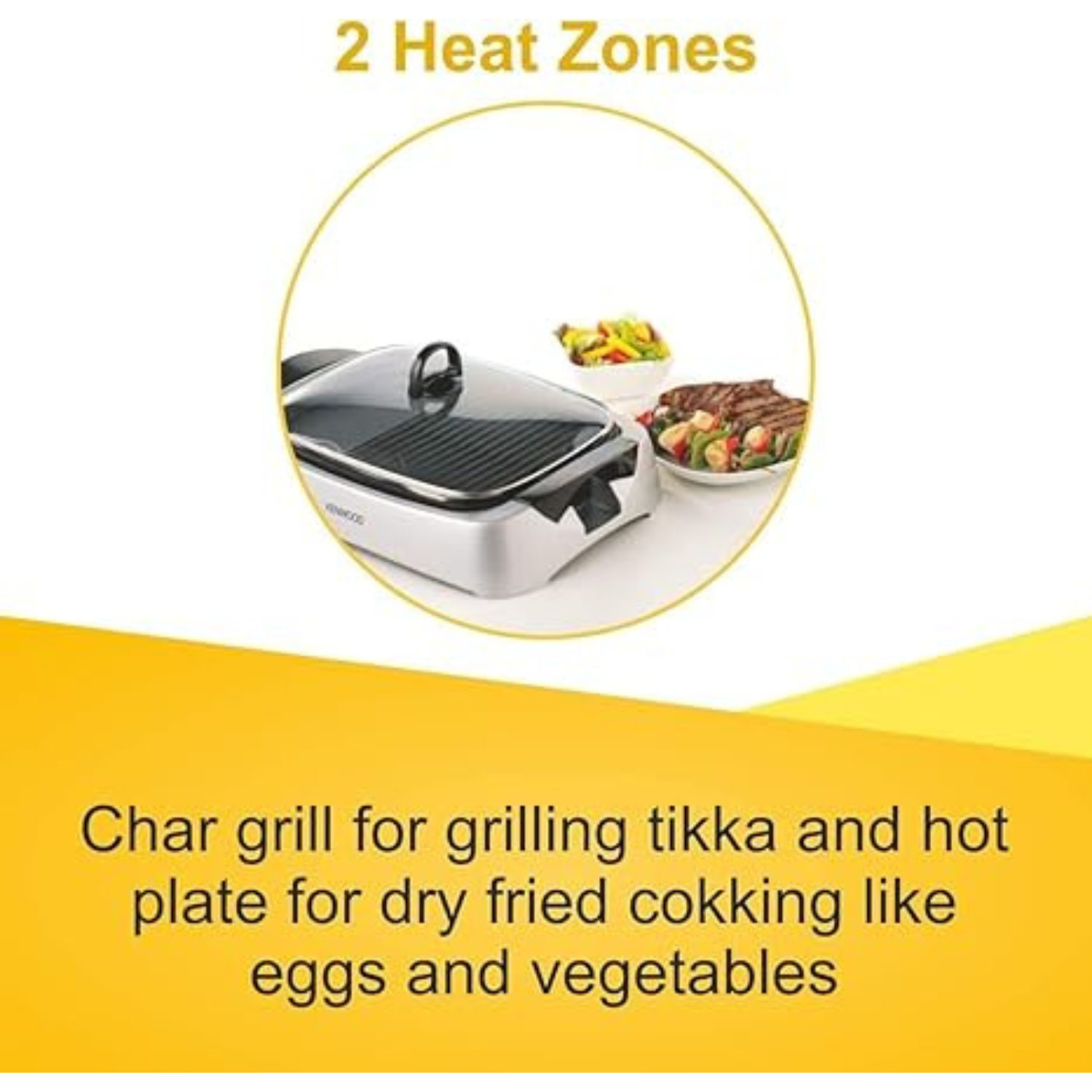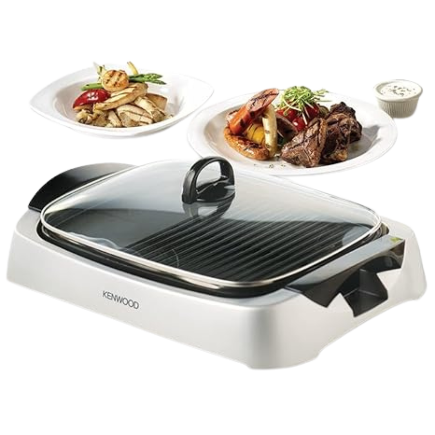 the kenwood healthy table top grill with its non stick grill plate with flat areas and variable temperature control is a very versatile grill and is ideal for a large variety of foods including steaks, fish, vegetables and much more comes with glass lid. 2000w, drip tray. easy clean removable parts.