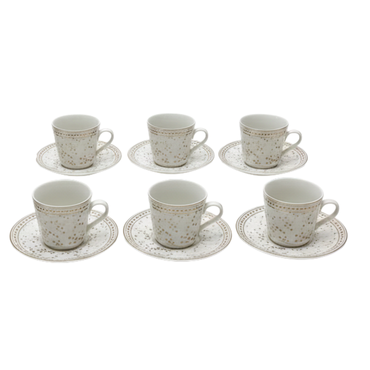 Gold Accents: Decorated with a gold-gilded rim that adds a royal touch to both cups and saucers.
