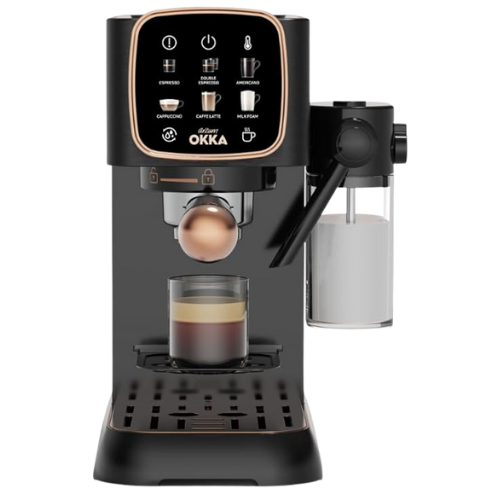 Keep your coffee at the perfect temperature with the practical cup warming feature, Effortlessly navigate the espresso machine’s intuitive menu with the vibrant and clear 4.3” OKKA Retina Display One-touch milk drink preparation Brew rich and delicious espresso every time with the powerful 15 bar pressure system. Single and Double Espresso Coffee Filter The adjustable double drip tray adapts to different sized cups and provides a clean and practical coffee experience.