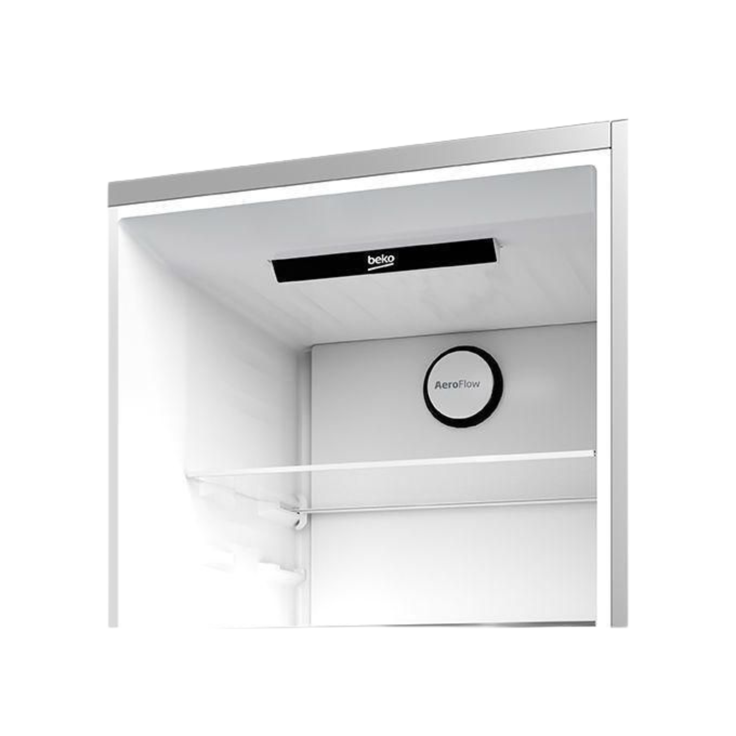 About product Brand Beko Style Freezer on bottom Key Features – SmoothFit door opens 90 degrees – Quick freeze. – AeroFlow technology for lasting freshness. – Harvest Fresh tray. – Reversible door. – Vacation Mode for extra energy saving – 3 freezer drawers. Capacity 367 Liters Type Freestanding Shelves Material Glass Dimensions (HXWXD) 186.5×59.5×66.3cm Color Silver Model Number RCNE367E30ZXB