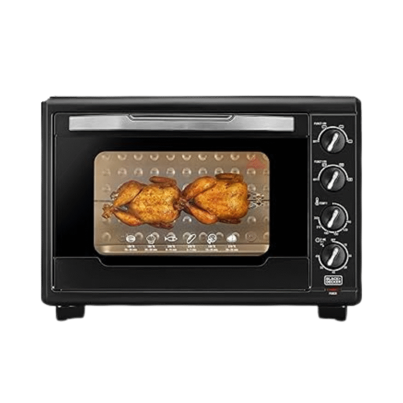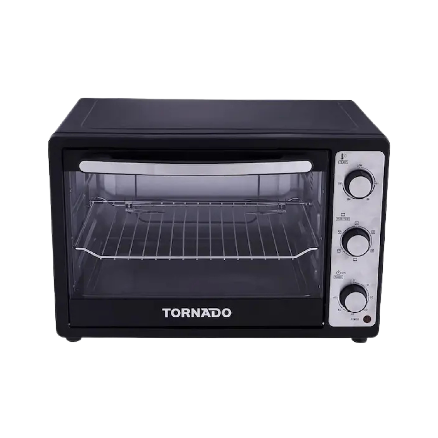 TORNADO Electric Oven With Grill and Fan Capacity : 48 Litre Electric Oven Power : 1800 Watt Color : Black Electric Oven Functions and Features :- Convection Fan To Distribute Heat Inside The Oven Thermal Load Function With Roast Function 6 Levels to Control Oven Functions Control The Temperature From 65ْ to 250ْ 4 Stainless Steel Heating Elements Timer up to 60 Minute Double Glass Door Stainless Steel Control Panel Upper Stainless Steel Holder With Interior Lighting Electric Oven Accessories :- With Wire Rack Tray Handle Rotisserie Fork Rotisserie Rod Rotisserie Handle Crumbs Tray Dimensions ( mm ) :- Width x Height x Depth : 530 x 360 x 455 Weight :- Net Weight : 11.3 Kg Gross Weight : 11.8 Kg Country Of Origin : Egypt Warranty : 1 Year Full Free Warranty