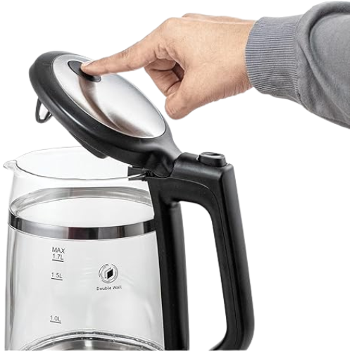 - غلاية زجاجية مزدوجة الجدار بسعة 1.7 لتر مع لمسة نهائية فاخرة من الفولاذ المقاوم للصدأ من أجل المتانة