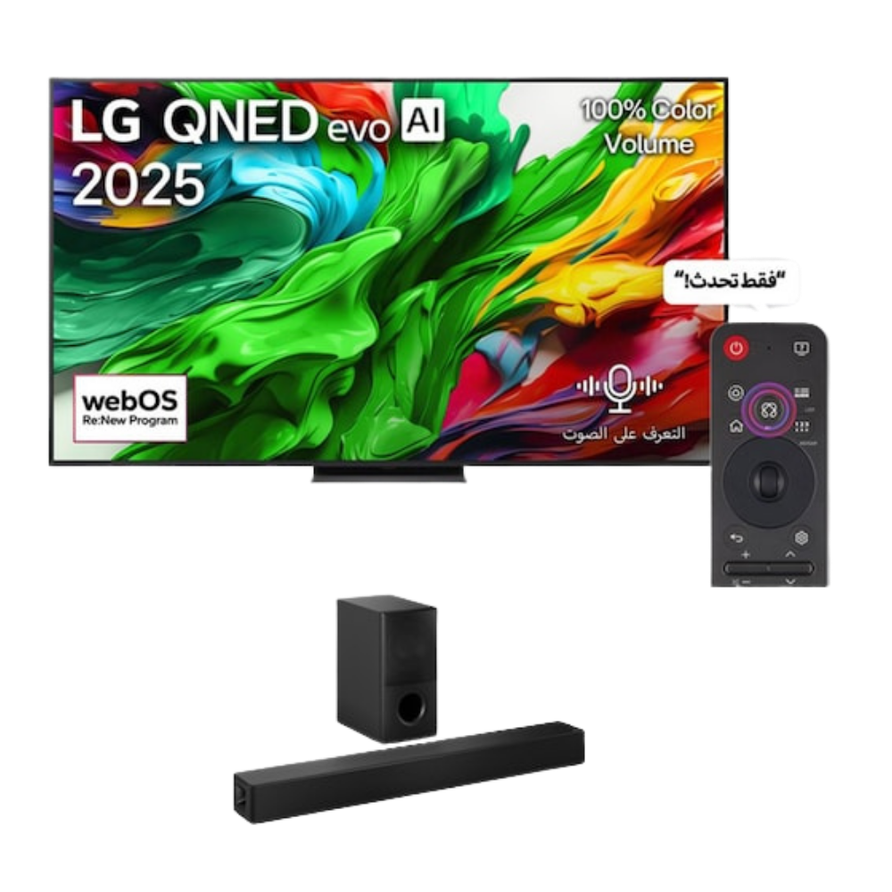 شاشة 65 بوصة LG QNED evo AI QNED86 MiniLED بدقة 4K بمعدل 120 هرتز، تلفزيون ذكي، ريموت ماجيك، نظام webOS25، إصدار 2025 + ساو ند بار مع خاصية WOW