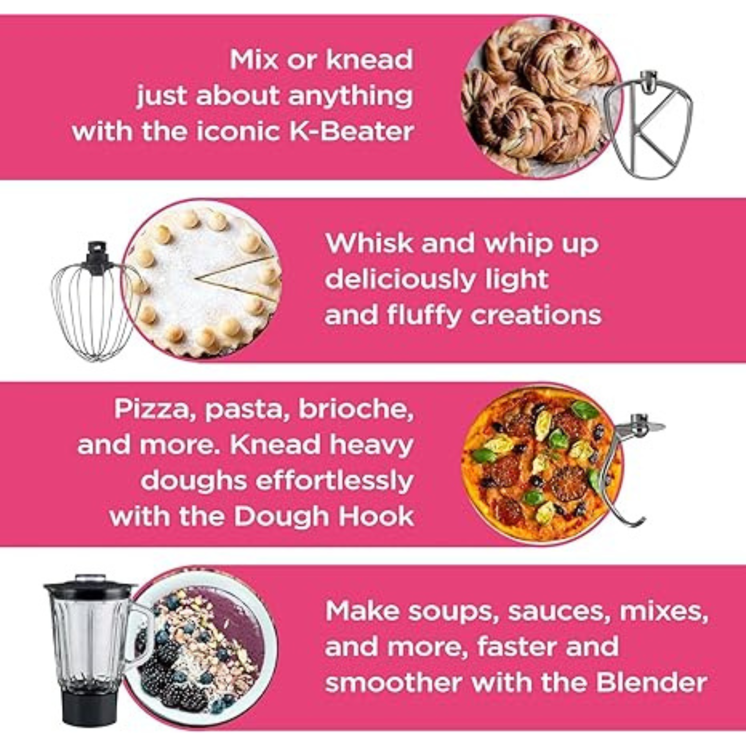 - خلط مثالي. تضمن عملية الخلط الكوكبي الشهيرة من كينوود مزج جميع المكونات بشكل مثالي مع عدم وجود أجزاء غير مخلوطة في عجينة البيتزا أو البريوش.