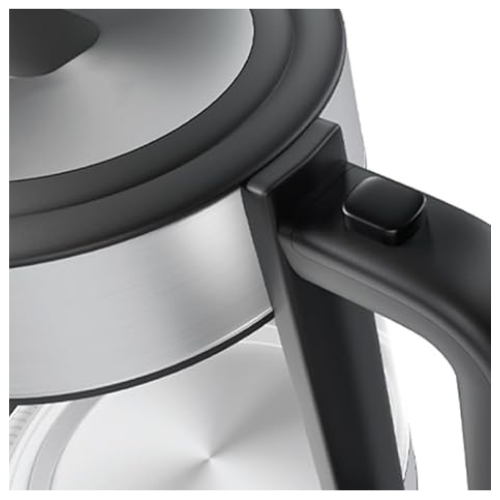 غلاية لاسلكية بقاعدة دوارة 360 درجة بقدرة 2200 وات وسعة 1.7 لتر مصنوعة من زجاج مقوى عالي القوة ومقاوم للحرارة، مزودة بعنصر تسخين مخفي وفلتر مضاد للتكلس قابل للإزالة وزرار لفتح الغطاء لضمان استخدام آمن، مع مفتاح تشغيل وإيقاف ومؤشر لمعرفة مستوى المياه