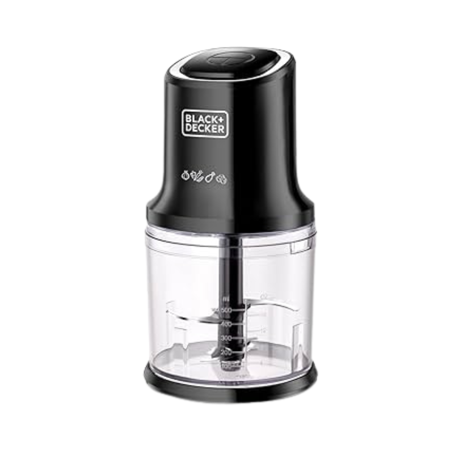 قطاعة عمودية بـ 4 شفرات متينة من بلاك اند ديكر، من الفولاذ المقاوم للصدأ وقدرة 500 وات وبولة بسعة 500 مل وحواف من الكروم المزخرف ومحرك قوي للتقطيع والهرس والفرم بلون أسود – موديل FC500-B5