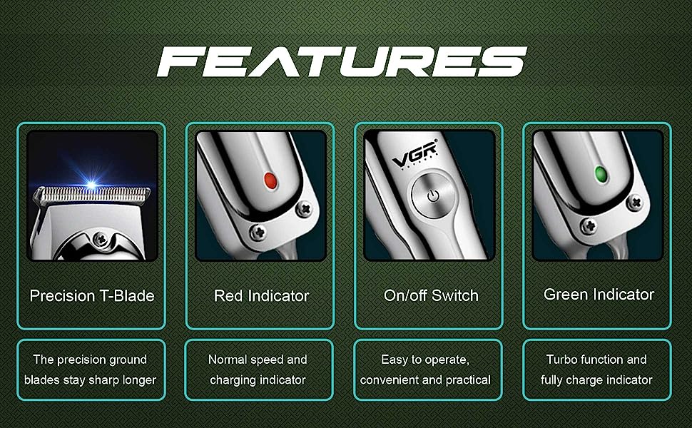 اشحنها لمدة 1.5 ساعة، اربط مشط التوجيه، اضغطي على التشغيل/الإيقاف لبدء التشغيل (مرتين لتربو)، قم بتشذيب الشعر ضد نمو الشعر. بعد الاستخدام، قم بإيقاف التشغيل ونظف الشفرة والزيت.