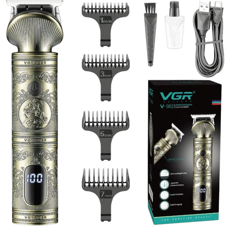- محتويات البيع: 1 ماكينة حلاقة الشعر، 5 قطع من مشط توجيه (1/2/3/4/5 ملم)، 1 غطاء حماية، 1 فرشاة تنظيف، 1 زيت تشحيم، 1 كابل شحن بمنفذ شحن USB، 1 شنطة سفر، 1 دليل الاستخدام