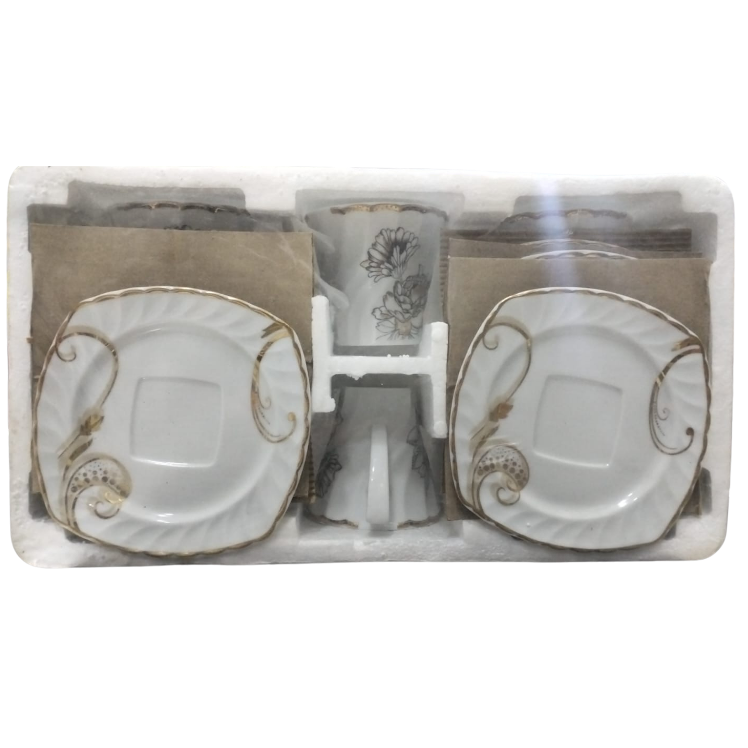 6 أطباق: أطباق مطابقة للفناجين بتصميم هندسي متناسق.