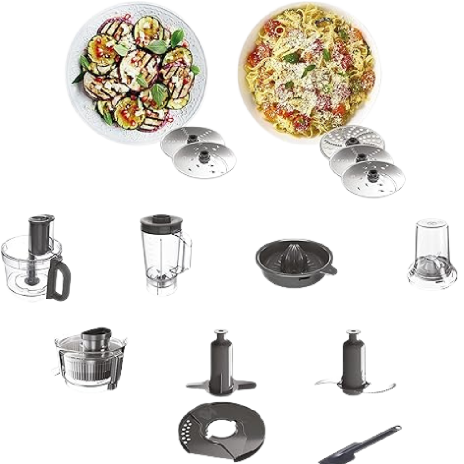 يأتي محضر طعام كينوود مع ملحق عجن 2 في 1 يكون مفيدًا لعجن العجين دون إحداث فوضى. يمكنك استخدام أقراص التقطيع والبشر والتقطيع وعصارة الحمضيات والملعقة لجعل عملك أقل استهلاكا للوقت.
