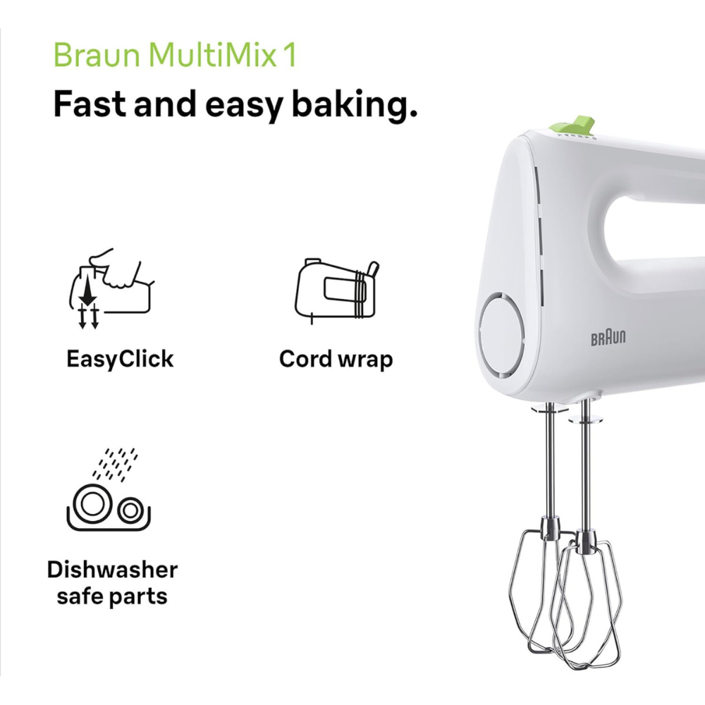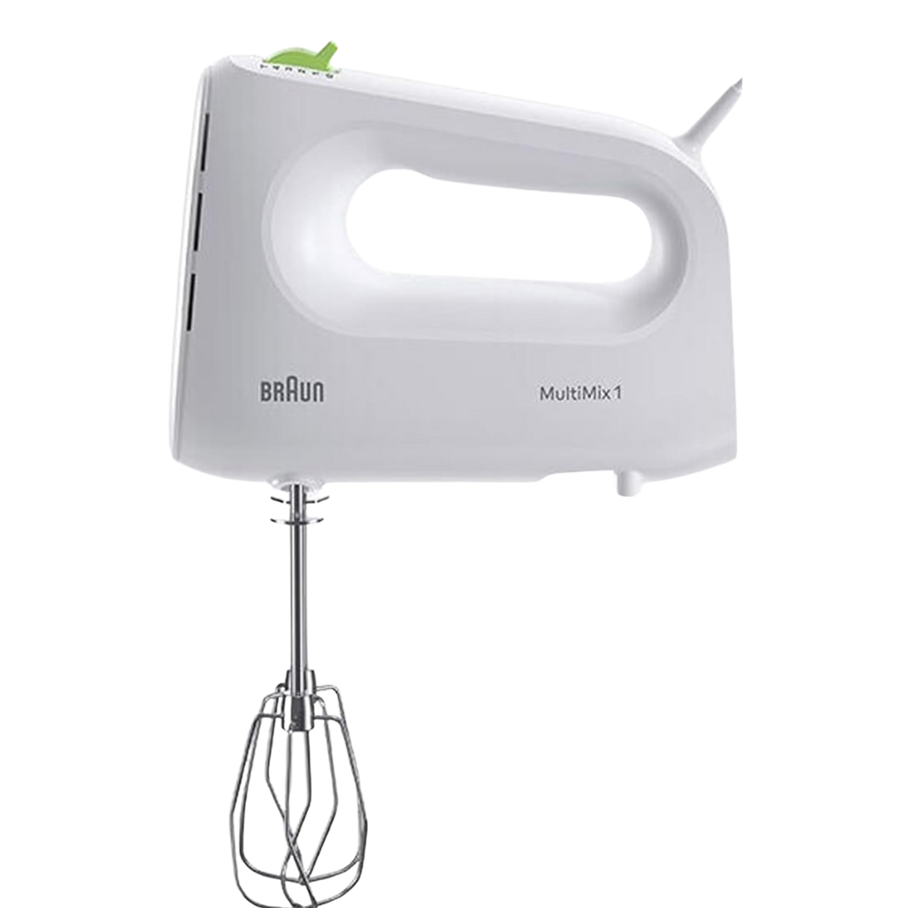 مضرب يدوي مالتي ميكس 1 من براون للخفق وعجن العجين، تقنية فاست ميكس، 4 سرعات + محرك توربو، 450 وات، مضارب من فولاذ مقاوم للصدأ HM 1100 – أبيض